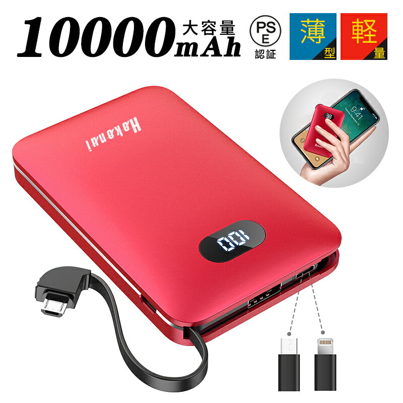 【期間限定特価】【月間MVP受賞】【2020最新モデル】モバイルバッテリー 大容量 10000mAh iPhone 軽量 小型 薄型 ケーブル内蔵 スマートフォン 充電器 パワーバンク テレワーク 在宅 自宅待機【メール便専用】